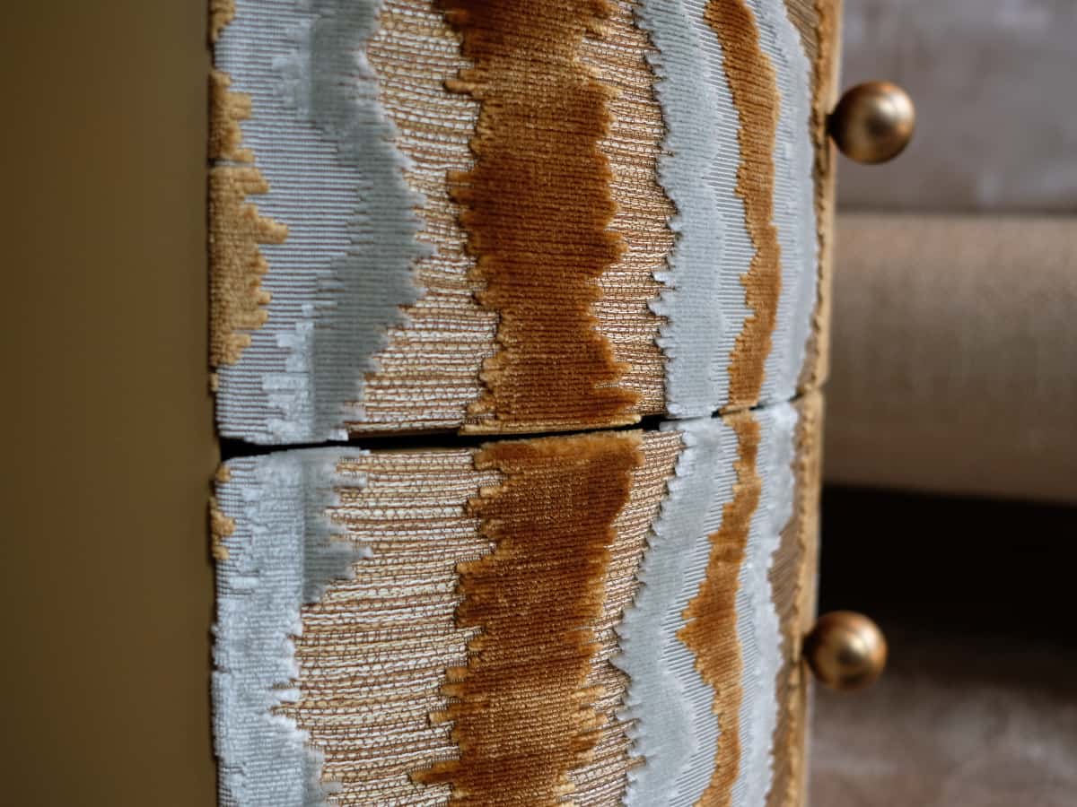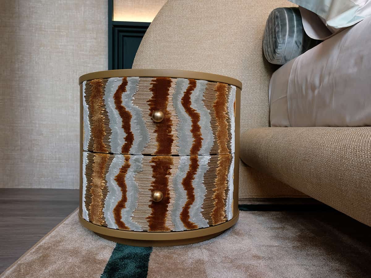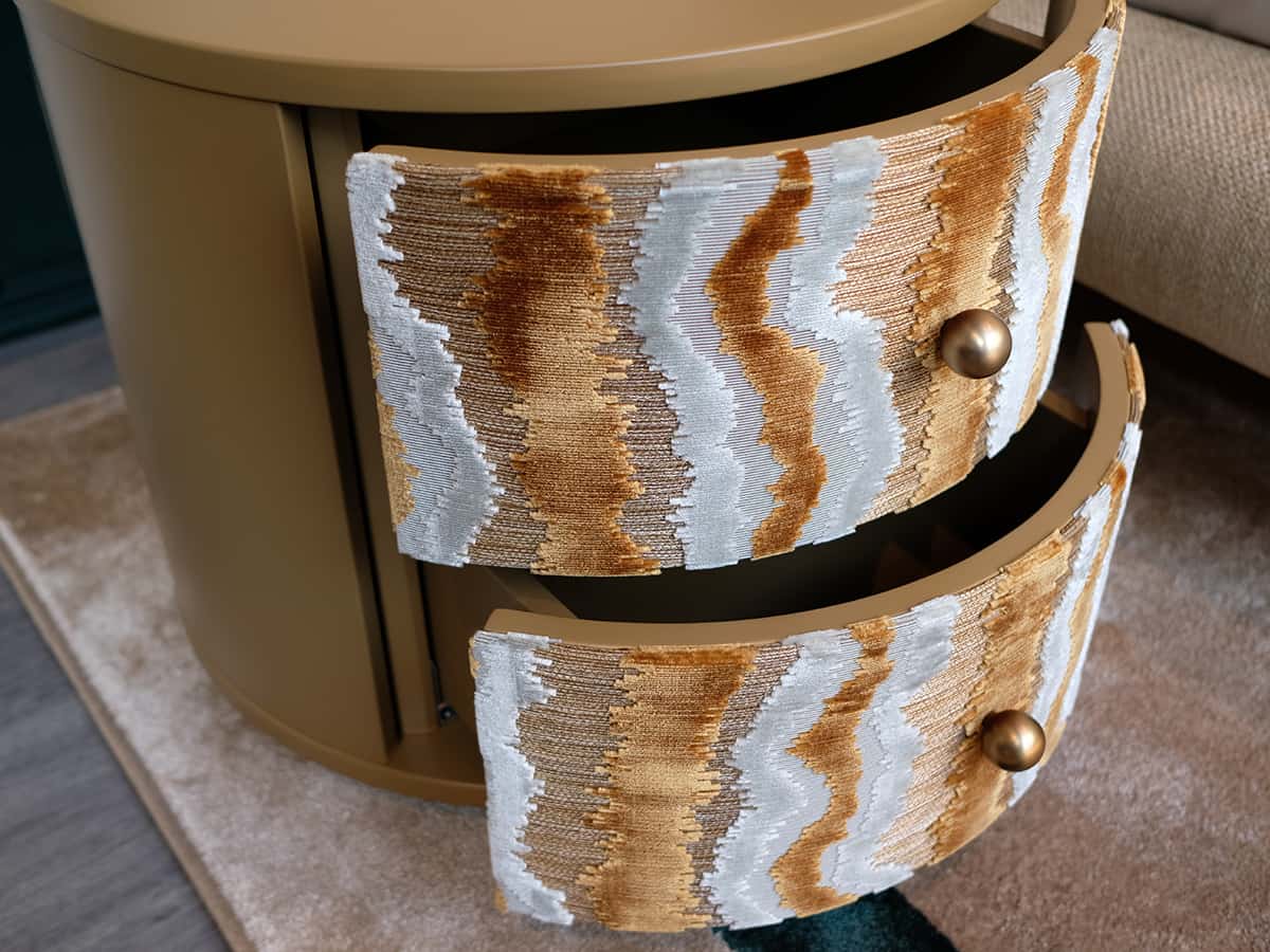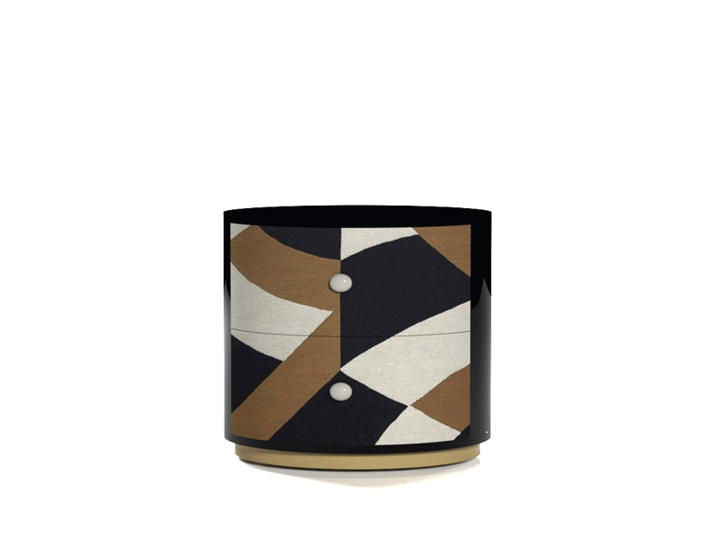La struttura in legno laccato ospita due cassetti rivestiti in tessuto, abbinati a una base e pomelli in metallo verniciato, per un contrasto ricercato e attuale.