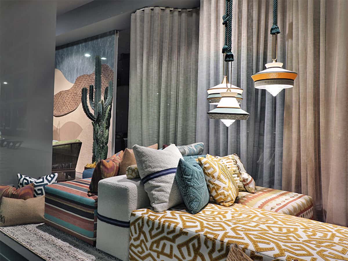 Ampie sedute in tessuto, geometrie leggere e volumi componibili definiscono un sistema flessibile, pronto ad adattarsi a spazi ampi o raccolti con la stessa eleganza.