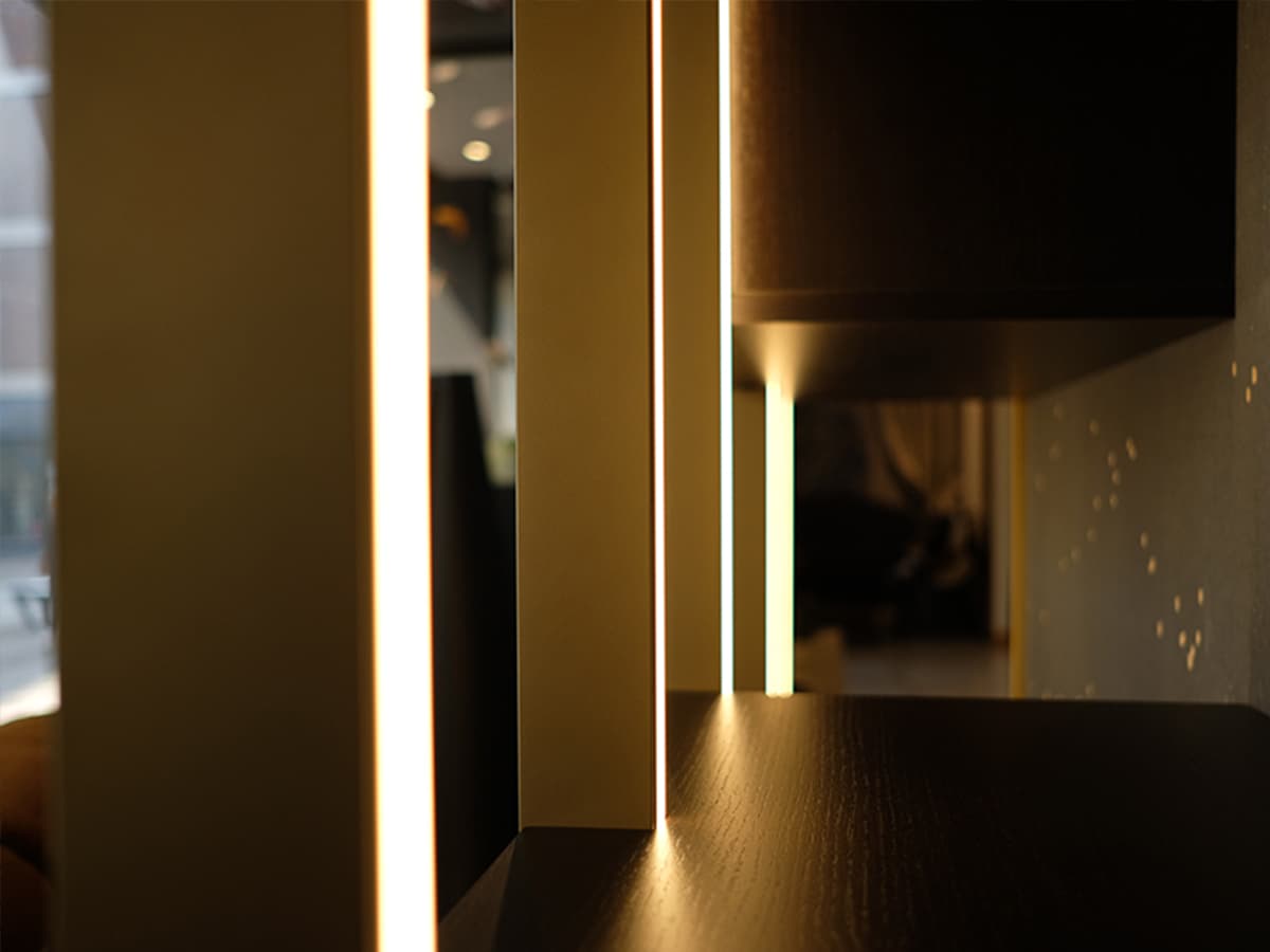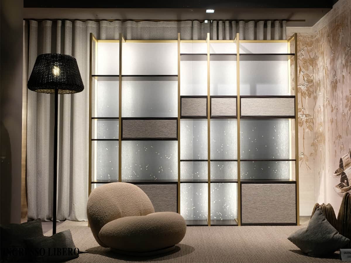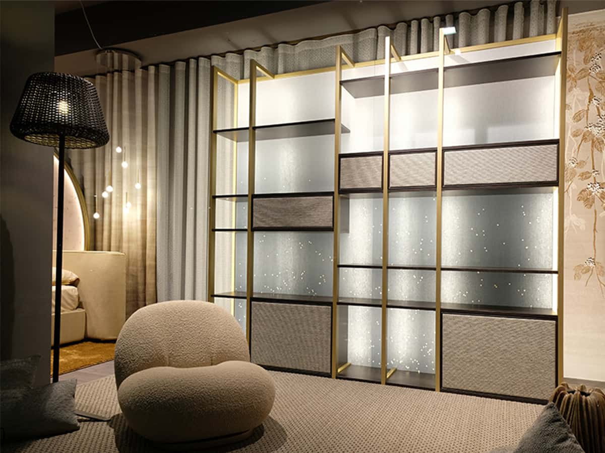 Il fondale, illuminato e rivestito in carta da parati, è il cuore estetico del progetto. Non esiste una gamma predefinita: si può utilizzare qualsiasi texture o carta dell’archivio Ariadimora, dando vita a librerie dal volto sempre diverso.