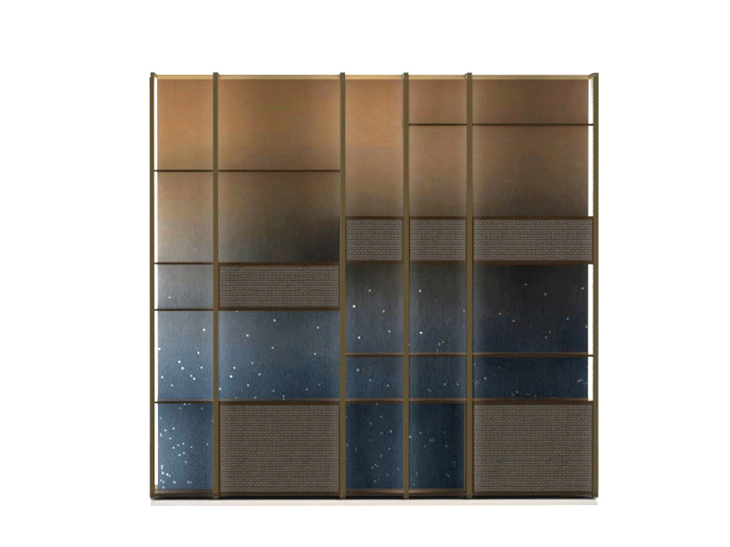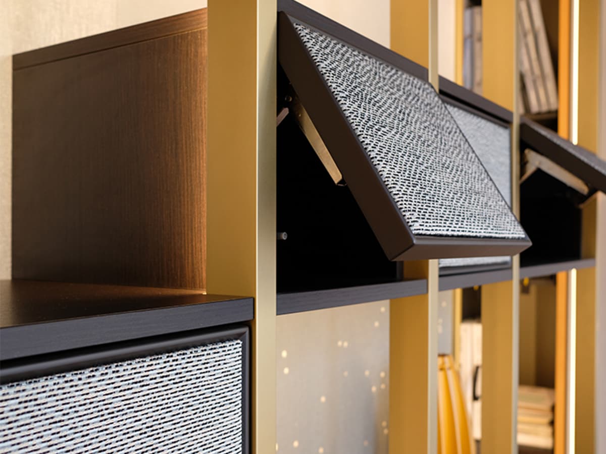 Antine e cassetti rivestiti in tessuto si alternano a mensole aperte, in un gioco calibrato tra pieni e vuoti.