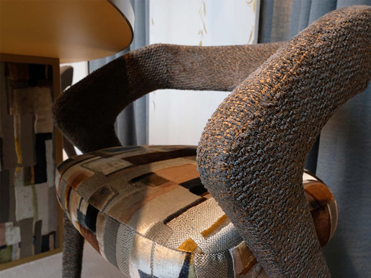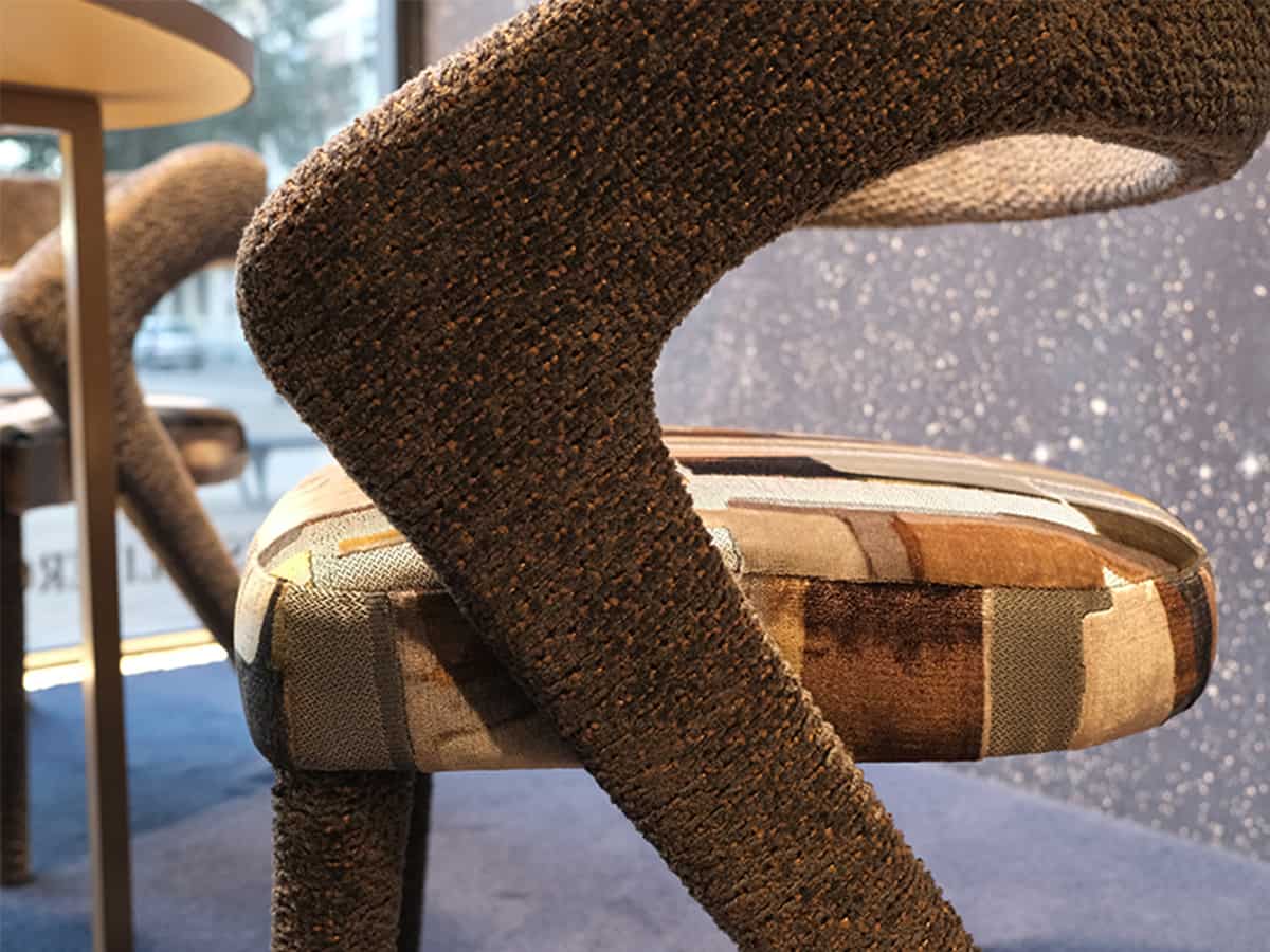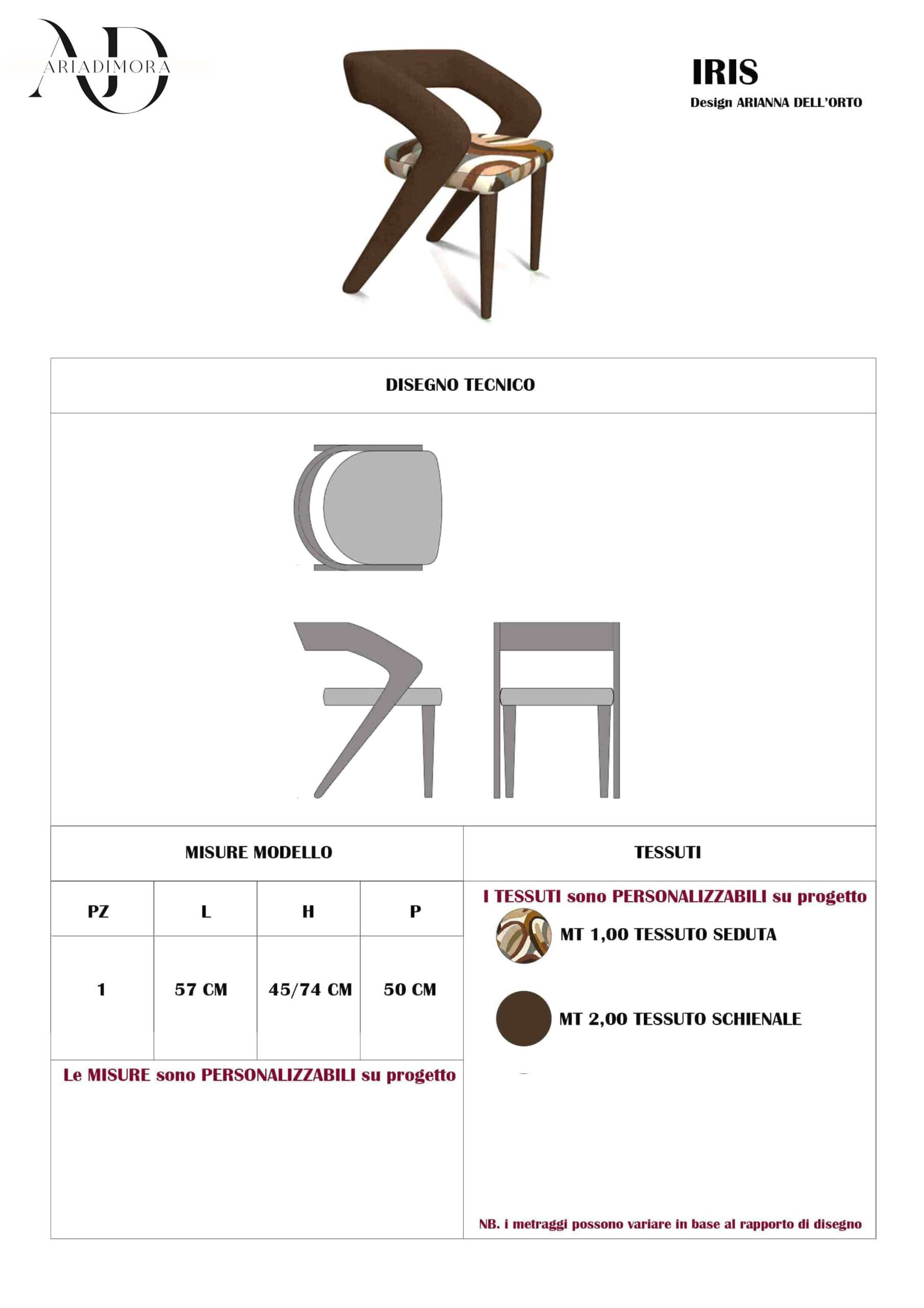 Il valore aggiunto di Iris risiede nella libertà totale di personalizzazione: non esiste una selezione predefinita di finiture. Il rivestimento può essere scelto tra le numerose proposte dell’archivio tessile Ariadimora, che include una vasta gamma di texture, trame e colori. In base al tessuto selezionato, la sedia può assumere identità molto diverse — sobria ed essenziale, oppure più scenografica e decorativa — adattandosi perfettamente a qualsiasi linguaggio progettuale.