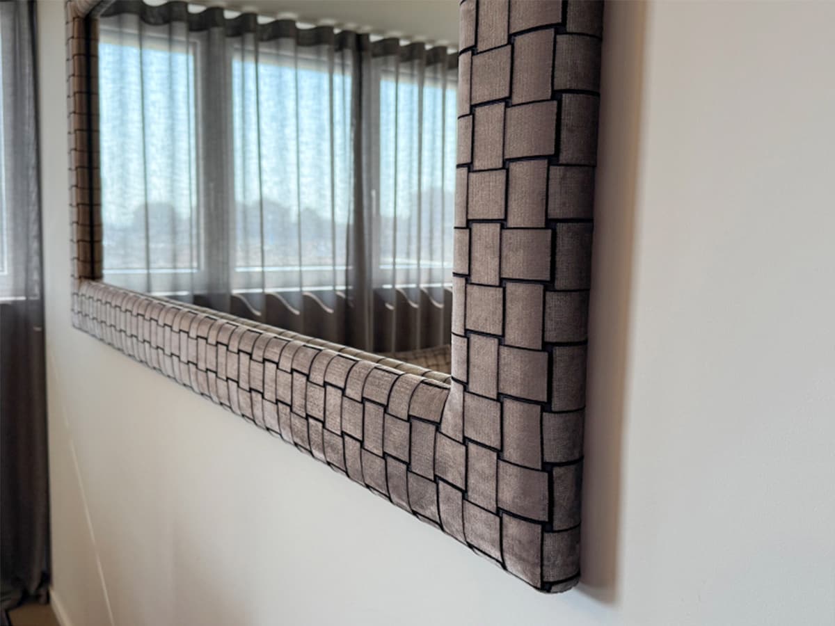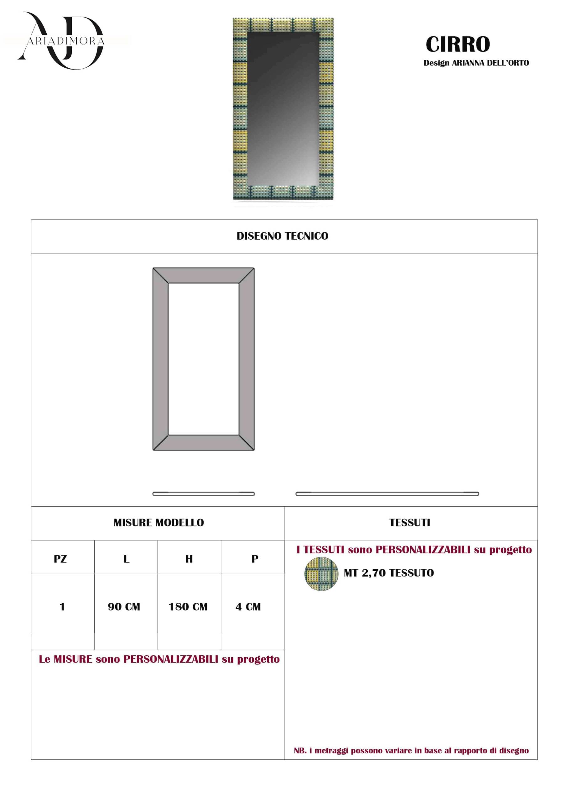 Ciò che distingue Cirro è la cornice imbottita e rivestita in tessuto, personalizzabile completamente su richiesta. Ogni esemplare viene realizzato a partire da un progetto su misura, senza limiti predefiniti. I clienti possono scegliere liberamente tra le numerose opzioni presenti nell’archivio tessuti Ariadimora, una selezione esclusiva di materiali che include texture leggere, fibre naturali, trame materiche e tessuti tecnici.