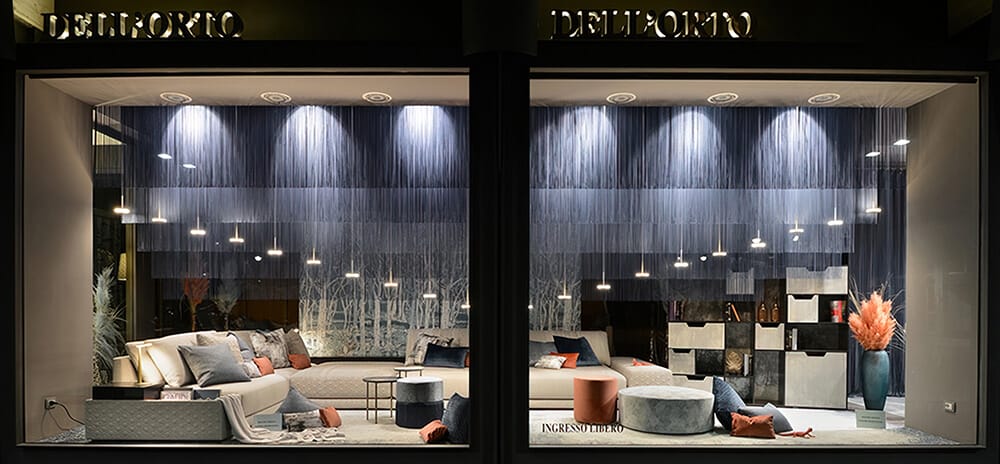 In particolare abbiamo utilizzato la carta e il lino stampato Portovenere rappresentante un villaggio tipico ligure: tante case dipinte intervallate da palme rivolte verso il mare con finestre chiuse e tetti in cotto. La fantasia Laghetto è invece stata utilizzata come fondale di un’altra vetrina; in lino stampato rappresentante una composizione subacquea pittorica di pesci e piante.