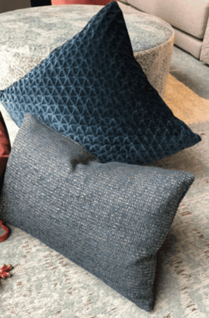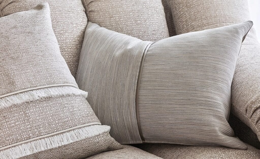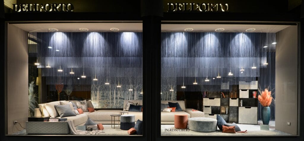 Abbiamo utilizzato per i cuscini del divano nella nostra ultima vetrina gli articoli Elliot e Calypso Zinc Textile.