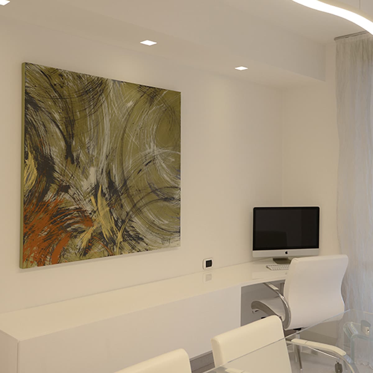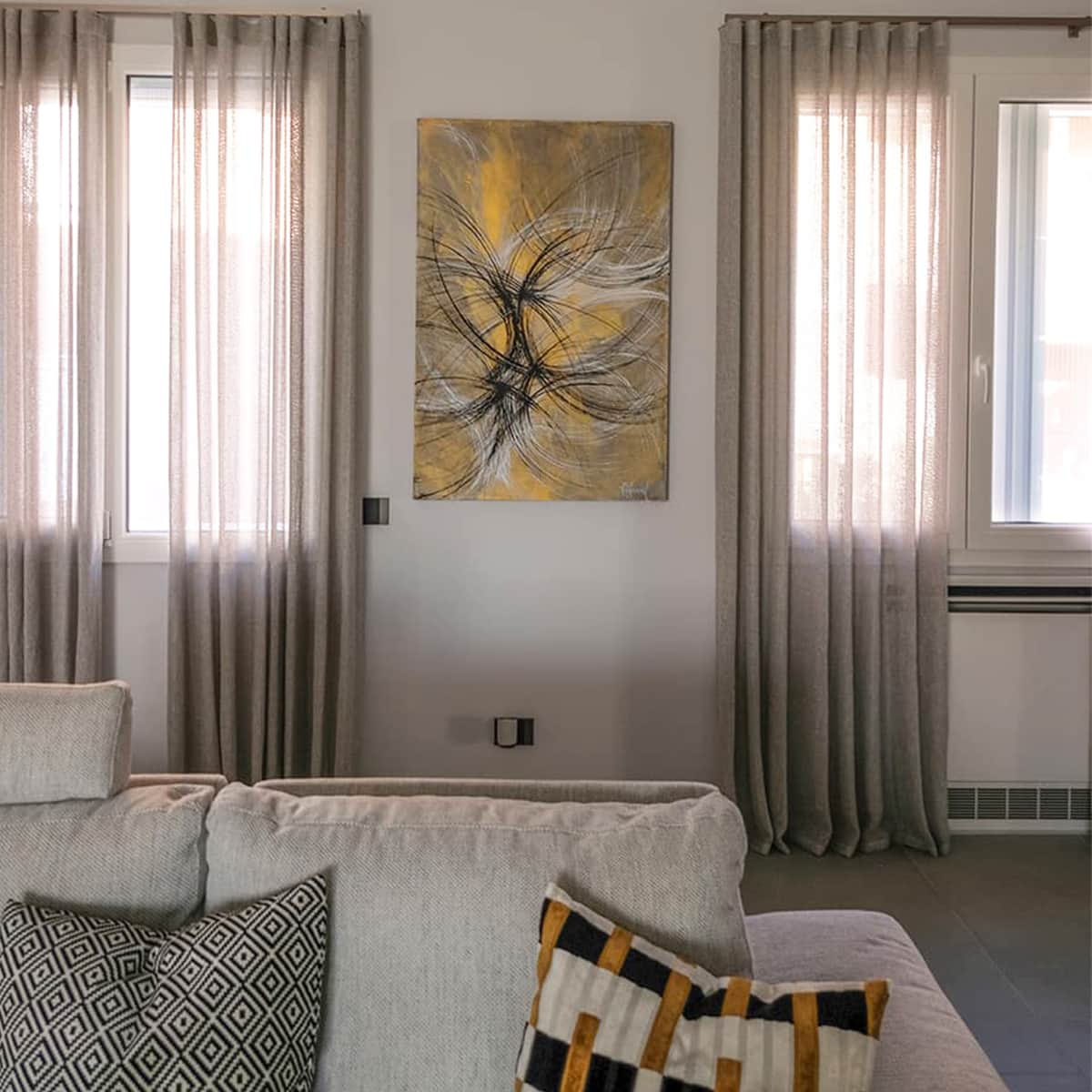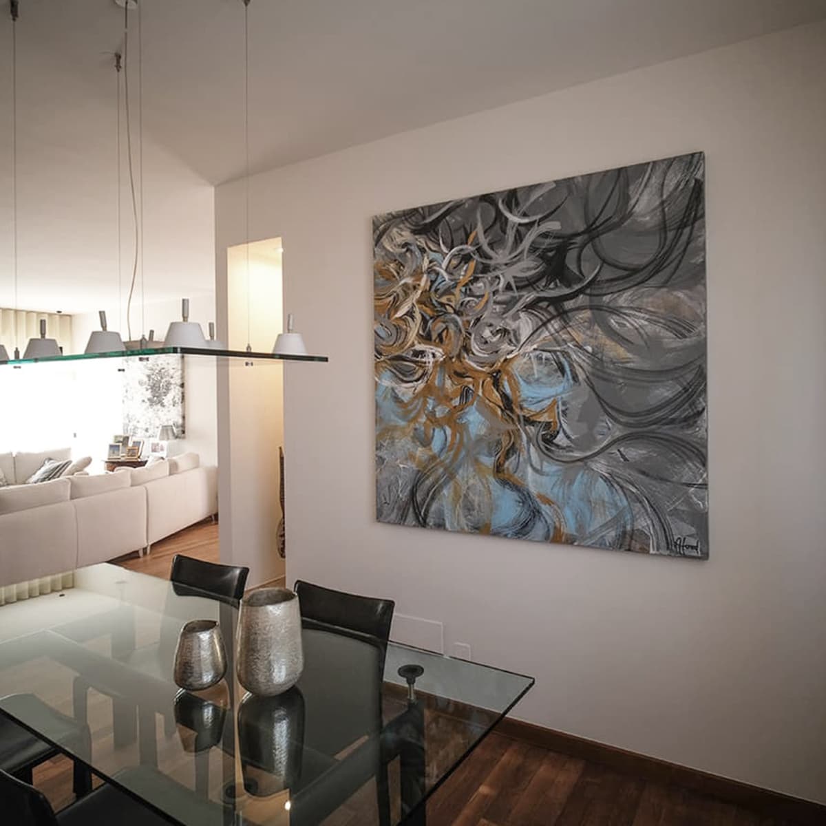 Le nostre creazioni si distinguono per l’uso di fantasie astratte, realizzate con la tecnica della spatolatura su tela, e sono studiate per integrarsi perfettamente con i colori e lo stile dell’ambiente circostante. Ogni quadro è fatto su misura, pensato per armonizzarsi con l’arredo esistente e rispondere alle specifiche esigenze estetiche e funzionali dei nostri clienti.